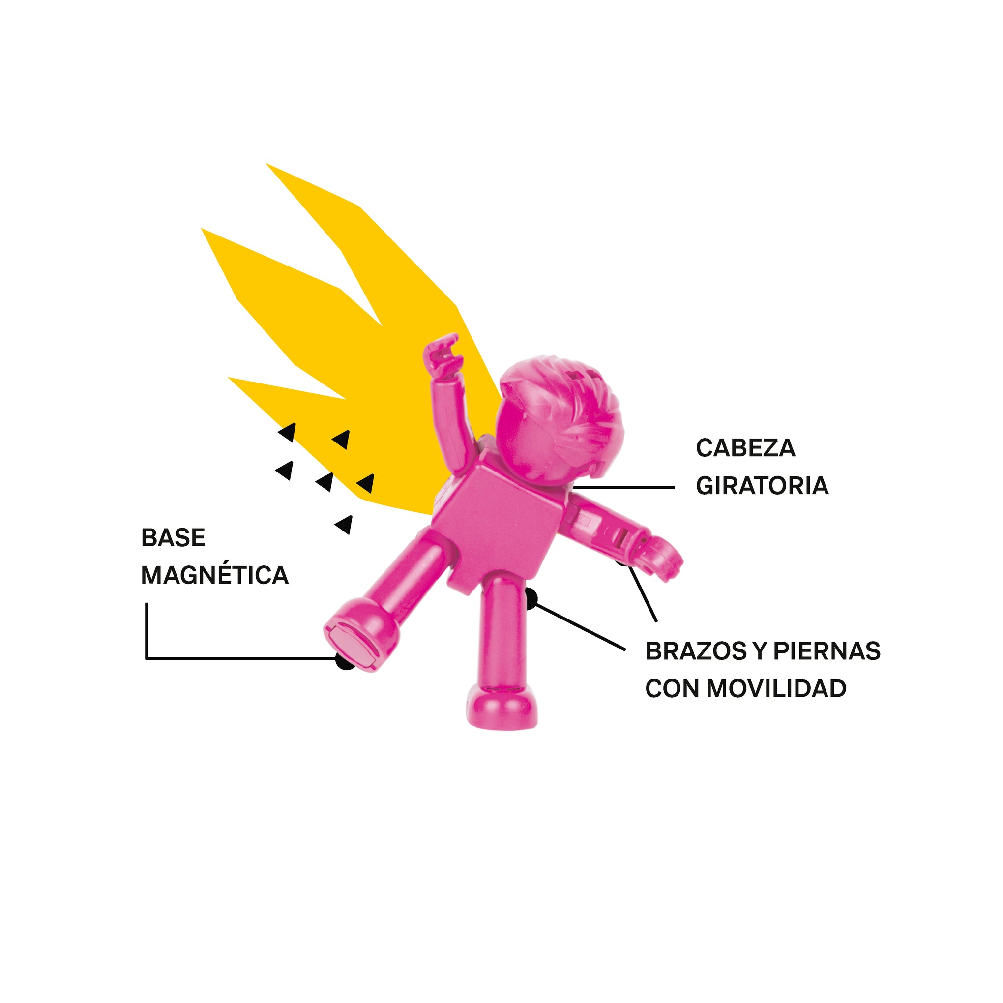 Incluye cinco personajes con cabezas giratorias,y bases magnéticas que facilitan la interacción y la creatividad.